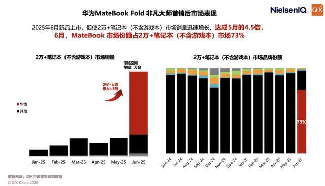 从市场层面来看,鸿蒙电脑的表现同样具备说服力。数据显示,2025年6月,华为MateBook Fold 非凡大师上市首月,直接带动2万元以上价位段笔记本市场销量增长至5月的4.5倍,其自身在该价位段的市场份额更是达到73%。